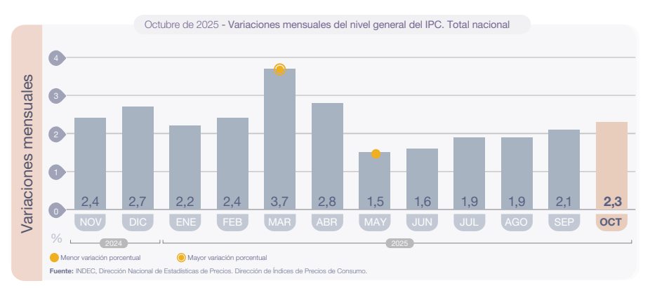 Como todos los meses, el INDEC dio a conocer el Índice de Precios al Consumidor. El dato estrella del informe es la inflación, que en el mes de octubre fue del 2,3%. Ese número marca el quinto mes consecutivo donde la variación mensual aumenta con respecto al mes pasado. Aún así, la variación interanual mantiene su tendencia a la baja.